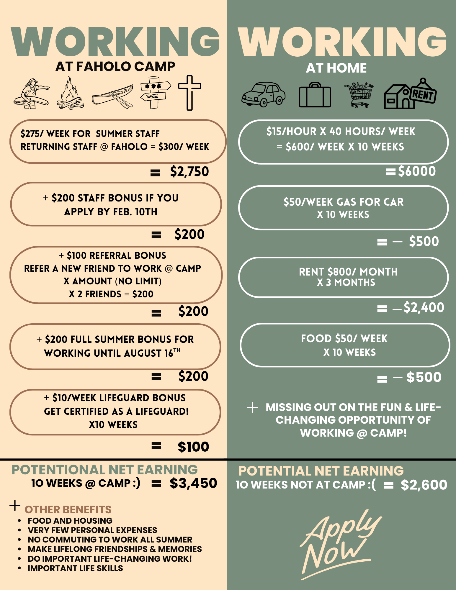 We want all staff to have a growing faith in Jesus Christ and the desire to live out their faith with staff and campers. Staff need to be at least 16 years old by the beginning of orientation on TBD Date. Faholo Summer staff job varies depending on the camp and level of understanding of each job and activity.